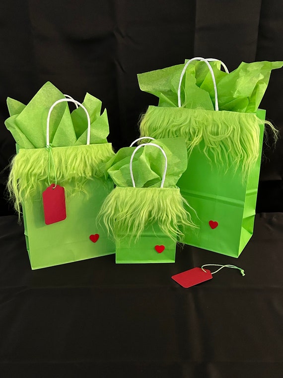 Furry Grinch Body Gift Bags With Tiny Red Wooden Heart Tags Green Tissue Paper Included 3 Size Options Christmas Gifts Etsy